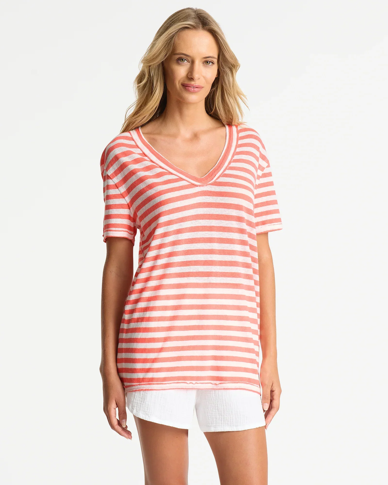 The Okanui Bay V Neck T-Shirt in Coral White is the iconic everyday stripe tee you’ve been looking for! Premium cotton and an oversized deep V neck, this shirt will compliment any outfit, perfect for any season. These high quality Okanui shirts are made to the same quality and care as all of our products. Shop for Okanui women’s shirts today!